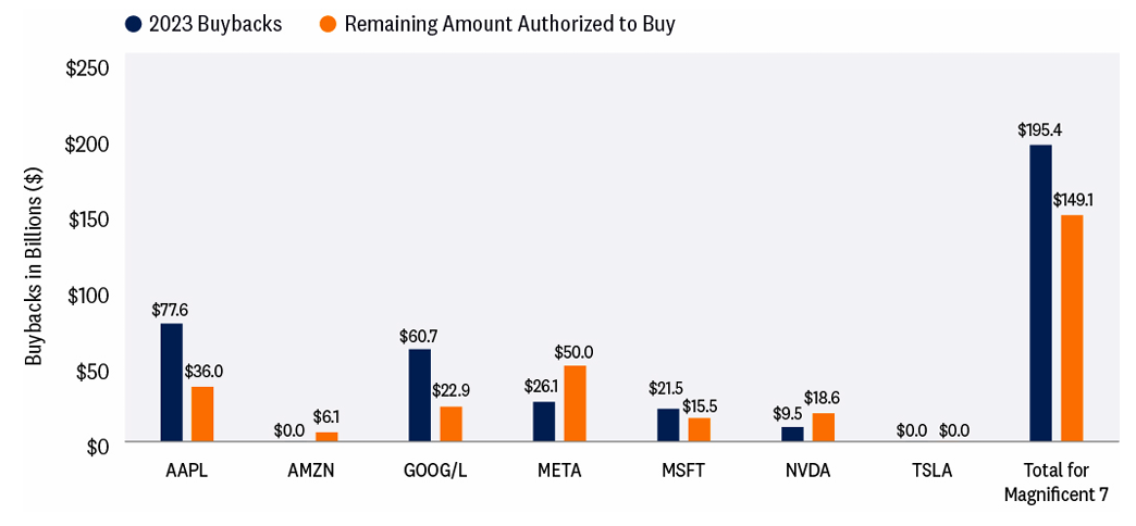 It is nearly impossible to have any market-related discussion without mentioning the Magnificent Seven, comprised of Alphabet (GOOG/L), Amazon (AMZN), Apple (AAPL), Meta (META), Microsoft (MSFT), NVIDIA (NVDA), and Tesla (TSLA). While these mega-caps have contributed to the majority of the S&P 500’s year-to-date gain and are solely responsible for lifting the index’s fourth quarter earnings into positive territory, most also have sizable buyback programs in place to support their stock. As illustrated in the “Magnificent Seven Buyback” chart, total buybacks for the group in 2023 totaled just over $195 billion, with AAPL and GOOG/L representing the lion’s share. Looking ahead to 2024, it could be another sizable year of share repurchases as the group still has $149 billion penciled in for buybacks.