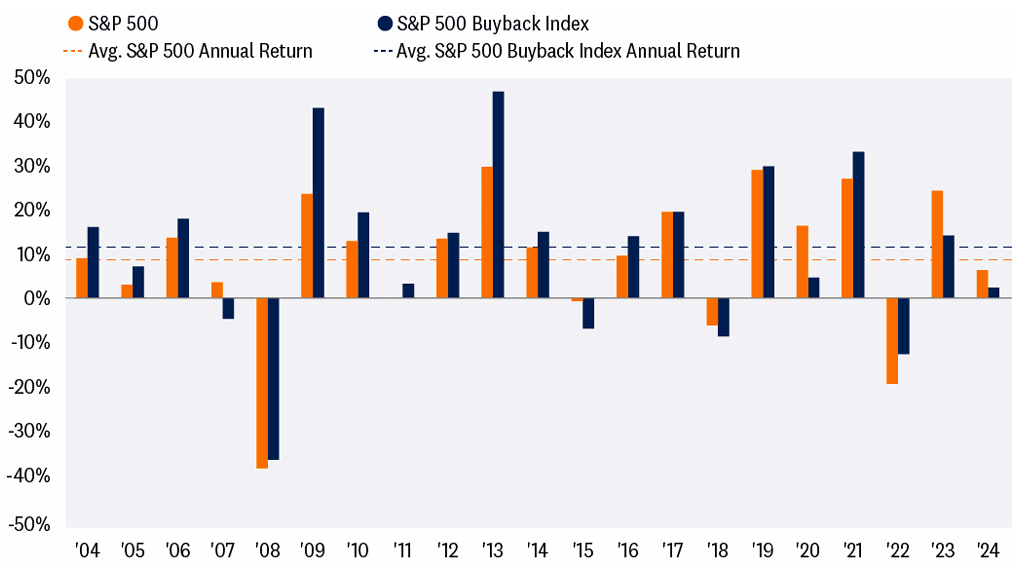While the S&P 500 Buyback Index is underperforming the broader S&P 500 by about 3% year to date, history suggests it could have some catching up to do. Over the last 20 years, the S&P 500 Buyback Index has beaten the S&P 500 71% of the time, amassing an average annual return of 11%. This compares to the S&P 500’s average annual return of 8.9% over the same period.