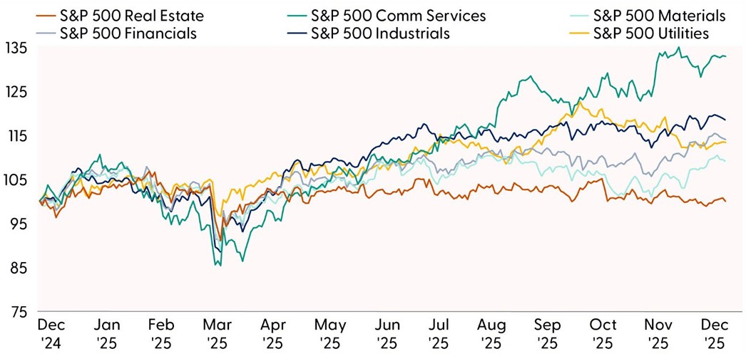Negative Real Estate Most of the Year — Hit. We started 2025 recommending an underweight to the real estate sector due mostly to our preference for more cyclical sectors with stronger earnings growth. We then turned neutral midyear before putting the underweight back on in November. Real estate slightly underperformed during both periods. STAAC maintained its underweight recommendation as 2026 began.