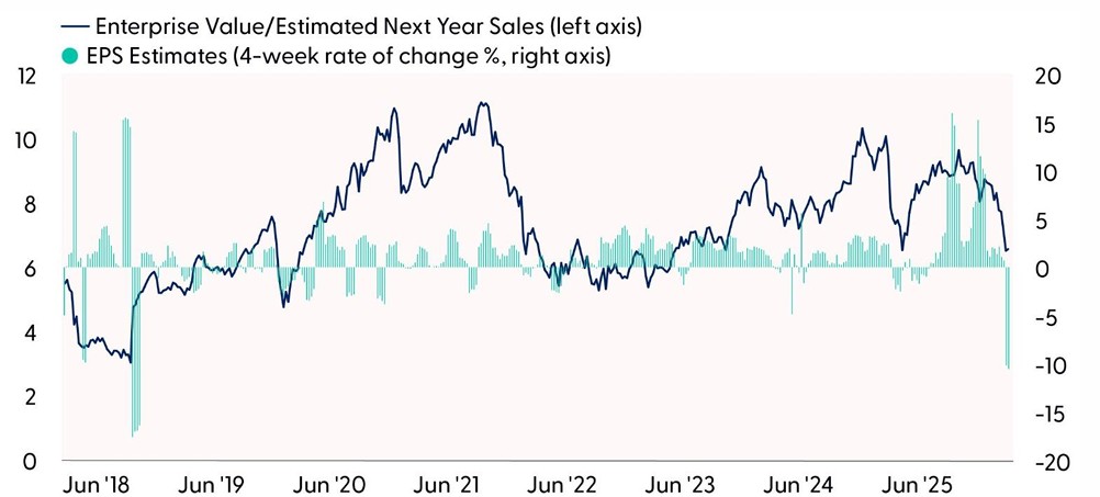 The drastic re-rating of software stocks has brought valuations to historically low levels. Full-year 2026 earnings per share (EPS) estimates for the S&P North American Technology Index have been cut by over 10% over the last four weeks, marking the largest rate of change since the Federal Reserve (Fed) induced market sell-off in December 2018. Even with the downward revisions, software is still expected to grow earnings this year by 25%, according to Bloomberg data. Operating margins are also expected to expand this year to 39% from 23% in 2025. The enterprise value to expected next year’s sales ratio (which measures a company’s current total value to projected revenue for the next 12 months), has dropped to only 6.6, the lowest level since April. While low valuations can sometimes signal deeper structural issues, we believe the recent re-rating may be overly punitive given the broader fundamental strength still evident across the software landscape.