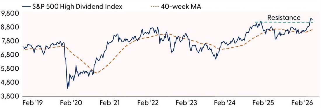 S&P 500 High Dividend Index (dividend yield): The index has seen a sharp acceleration over the past month as declining yields have boosted the relative attractiveness of dividend-oriented stocks. Sector positioning has also been supportive, benefiting from a rotation toward value and away from mega-cap tech and AI-related disruption risks. (Real estate represents roughly 25% of the index and consumer staples about 18%.) From a technical perspective, the index is consolidating within a short-term bullish flag pattern after breaking above resistance at the 2024 highs. A close above 9,445 would confirm a breakout and open the door to a target of 10,175 — approximately 9% above current levels. Relative performance versus the Equal Weight S&P 500 Index has improved notably in recent months, though it remains below a longer-term downtrend. A sustained move above the August 2025 highs on the ratio chart would signal a new uptrend and point to more durable outperformance ahead.