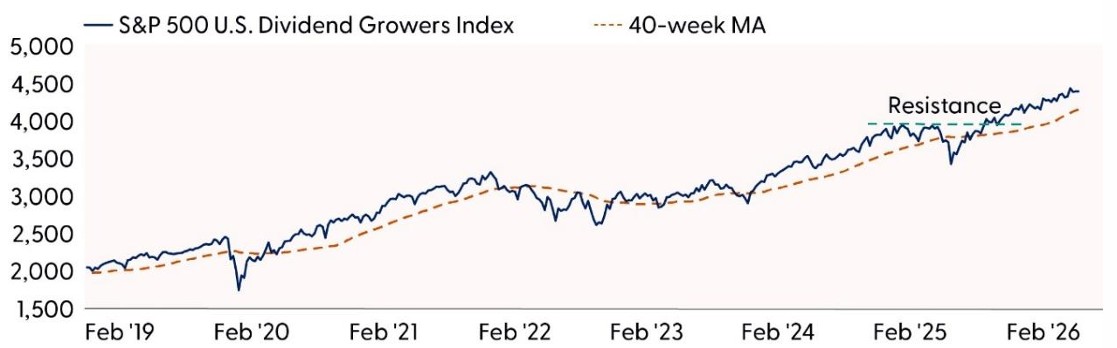 S&P 500 U.S. Dividend Growers Index (dividend growth): The index has climbed steadily above a consistent uptrend that has been in place since April 2025. Realized volatility has been exceptionally low, with the index registering a maximum drawdown over this period of only around 3%. Momentum indicators remain bullish, but not overbought, and point to further upside potential. On a relative basis, the S&P 500 U.S. Dividend Growers Index has broken out of a bottom versus the S&P 500, pointing to further runway for outperformance.