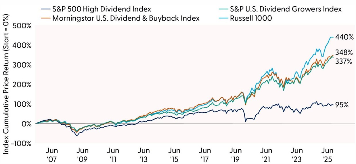 Looking ahead, the historical results make clear that simple dividend screens may not be adequate for today’s market environment. As capital allocation practices evolve and corporate balance sheets continue to diverge in quality, the opportunity set for equity income investors will increasingly support looking to approaches that go beyond headline dividend yields. A continued shift toward strategies that balance income with capital appreciation (dividend growth), total shareholder return (shareholder yield), and balance‑sheet strength (quality integration) will be essential for generating more resilient outcomes over time.