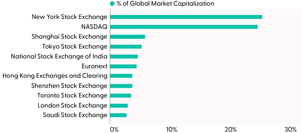 Despite recent shifts, including trade policies, inflation concerns, and geopolitical tension, which have led some to predict U.S. exceptionalism will fade, we think the U.S. will maintain its unique role in global markets for a variety of reasons. One structural reason is that this country has deep capital markets.