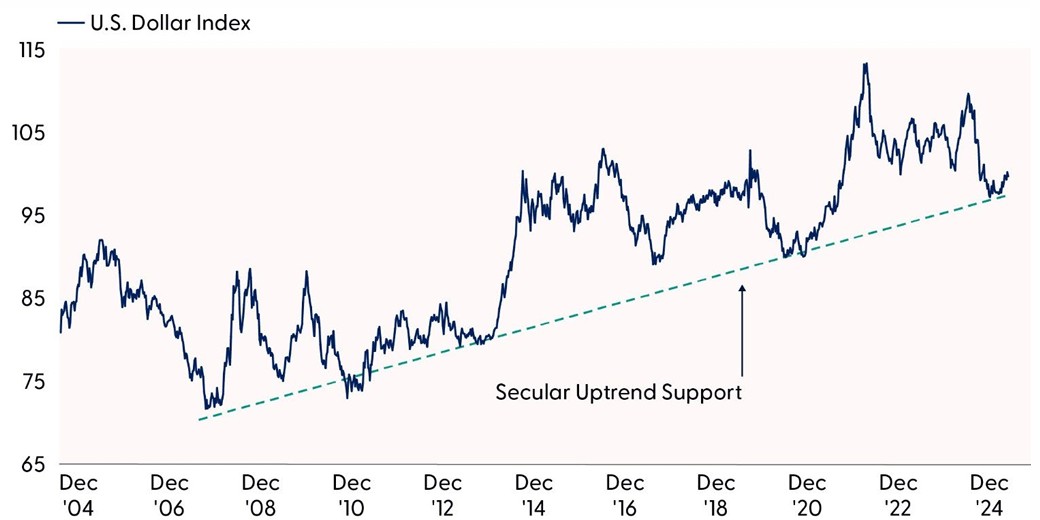 Despite sharp swings in 2025, the dollar’s decade-long rising channel remains intact. The recent pullback found support off a longer-term trend line, reinforcing the secular uptrend illustrated in the “Dollar Bulls Hold the Line” chart. A sustained break above 100.35 could confirm a short-term bottom, while a drop below 96 would signal a structural shift, potentially ending the uptrend and ushering in a bearish cycle for 2026.