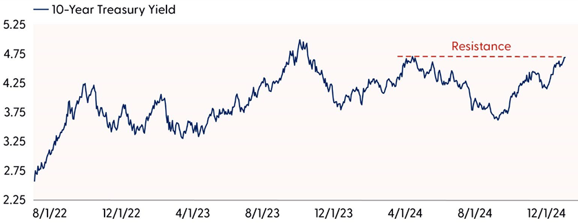 Technical trends point to upside risk for yields. The 10-year has recently reversed a downtrend and surpassed several key areas of overhead resistance. Regarding potential upside, a close above the April highs at 4.74% would likely open the door for a retest of the October 2023 highs near 5%.