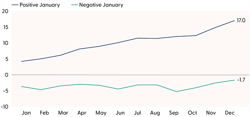 S&P 500 Annual Performance Based on January Returns (1950–2024)
