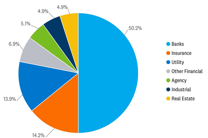 That said, and as mentioned above, it’s important not to paint a broad distressed-brush across all CRE sectors. The office sector only represents roughly 19% of total CRE loans and other sectors, such as malls and hotels, are performing fine. It’s the office sector that is the primary challenge for financial institutions, and even there, the financial institutions at elevated risk are the smaller and more regional banks that make up over 60% of lending to the office sector. As such, less than 40% of lending comes from national banks, which tend to make up the majority of preferred security issuance. Depending on the index, regional banks only make up a high single/low double-digit percentage of preferred security issuance.